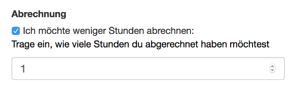 Du kannst nun eine (kommagetrennte) Zahl eingeben, die kleiner als deine geleisteten Stunden ist. Möchtest du die volle Zeit abrechnen, bleibt der Haken einfach deaktiviert.