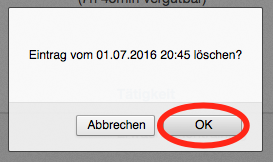 Klickst du auf OK, wird der Eintrag aus dem System entfernt. Die Dauer des Eintrags wird von deinem Stundenkonto abgezogen.