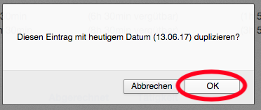 Dupliziert diesen Eintrag mit heutigem Datum. Klickst du den Button an, fragt dich das System, ob du wirklich einen neuen Eintrag erzeugen möchtest.