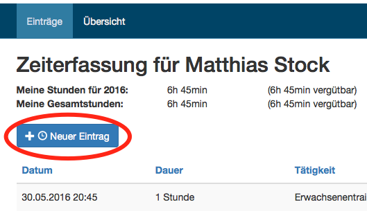 Nachdem du dich erfolgreich angemeldet hast, klickst du auf deiner Übersichtsseite auf den Button "Neuer Eintrag".