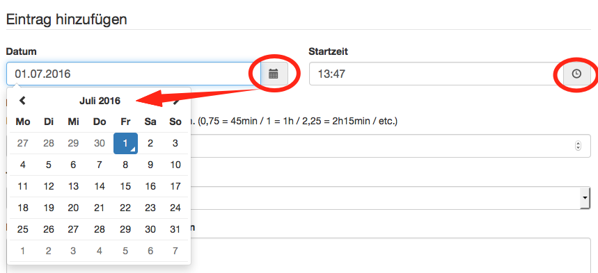Jetzt erscheint der Stundendialog. Hier kannst du Datum und Startzeit der Tätigkeit ausfüllen. Trage Datum und Zeit direkt ein, oder klicke auf das Kalender- bzw. das Uhrensymbol (roter Kreis) um Datum und Zeit auszuwählen: